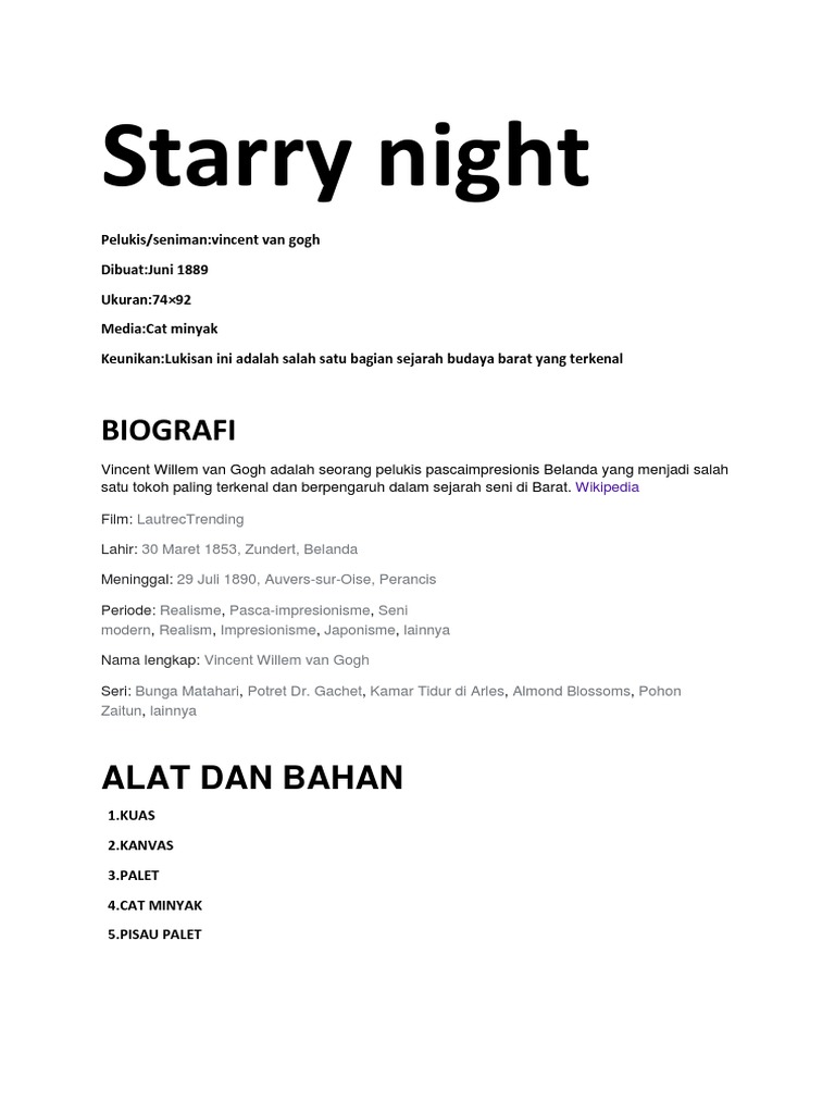 Lukisan ini menjadi salah satu masterpieces dunia. Lukisan the starry night dilukis oleh pelukis asal belanda yang bernama vincent van gogh pada bulan juni tahun 1889. Kalau bapak bilang a ya, saya menurut saya, buku starry night bisa memberikan referensi kepada saya dan pasangan bagaimana menyelami hubungan beda latar belakang ini. Muslimah bersayap kanvas bersenjata kuas dengan jurus. Starry night dibuat disaat van gogh berada di rumah sakit jiwa saint starry night.